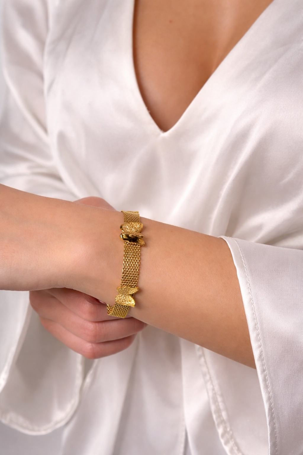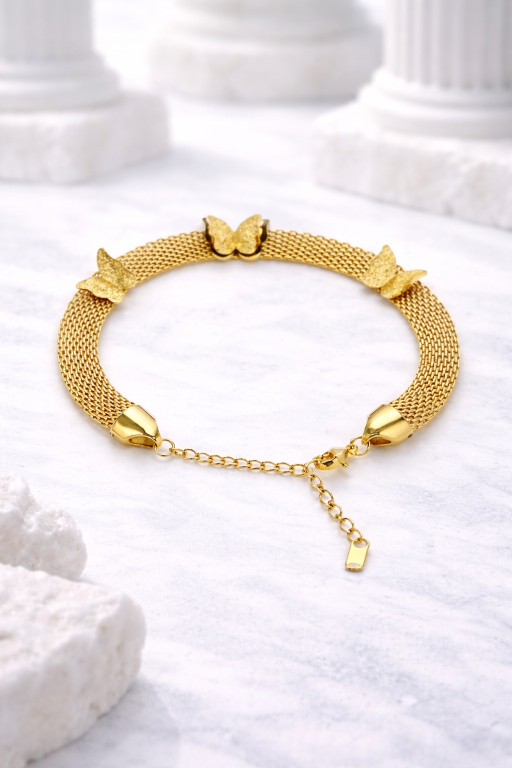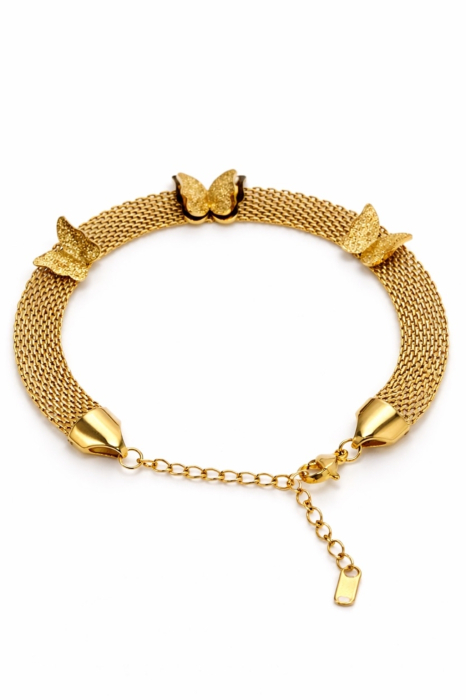 Fluturii aurii, sculptați cu finețe pe o bază din oțel inoxidabil placat cu aur 18K, dansează delicat pe piele, purtând în aripile lor sclipiri de lumină și speranță.